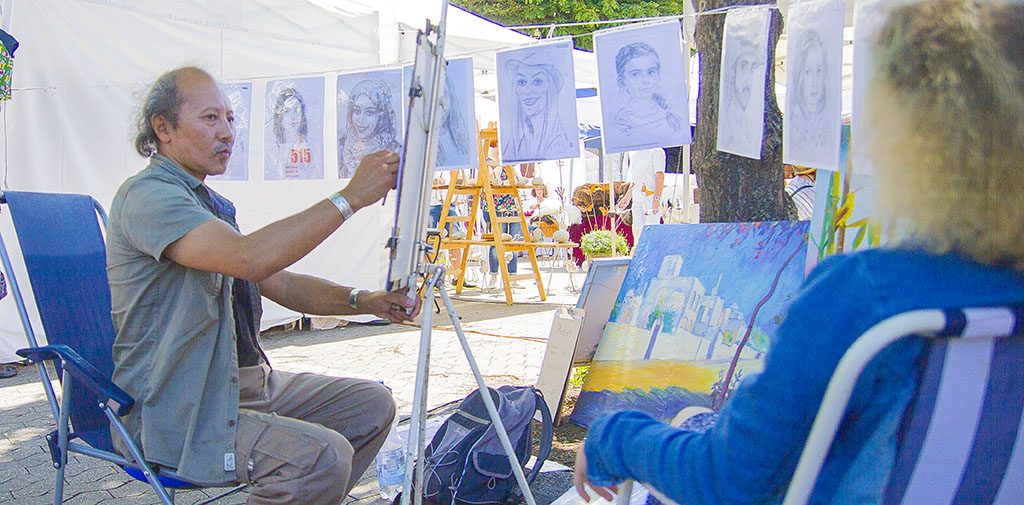 Die Künstlerin Gerlinde Weidner-Theisen und ihre Künstlerkollegen stellen ihre vielfältigen Werke im Sitzungssaal der Halle aus.